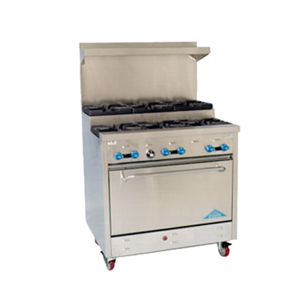 Automatic standing pilots, brass top burner valves, and pressure regulators help ensure that this Step-Up Range keeps operating efficiently. This Gas Range uses 174,000 BTU of power through its cast iron "H" pattern oven burners and its "star" pattern top burners. By using "star" pattern burners, this Restaurant Range can reach a full 7" flame spread, offering more efficient heat for large and small pans.