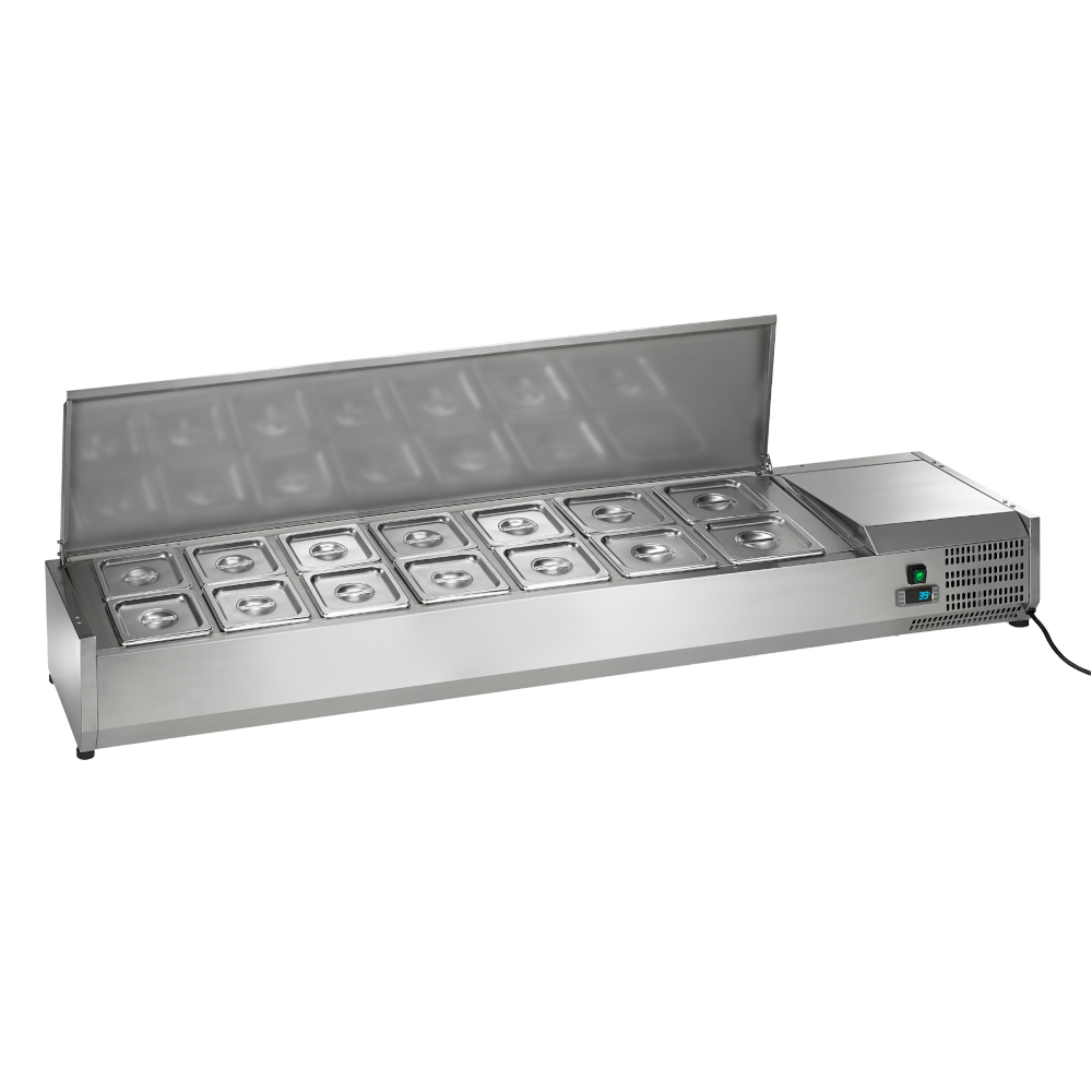 This Arctic Air ACP63 63" Refrigerated Counter-Top Pan Rail uses environmentally friendly refrigerant to keep your products between 33°F to 41°F. Its electronic thermostat with external digital LED display allows you to accurately set and monitor temperatures. With a stainless steel construction, this Pan Rail is durable and easy to clean. It has a fully stainless steel liner for its interior cabinet and it has plastic non-stretch feet. It comes with 1/6 size stainless steel pans, covers, and pan supports. This ACP63 has been tested to NSF Standard 7 requirements for open food storage.