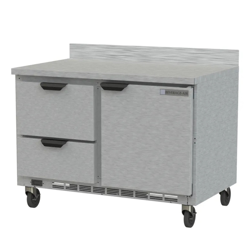The Beverage Air WTRD48AHC-2 has a heavy duty construction that includes exterior stainless steel on front, sides, drawers and grille. Stainless steel 2 1/2” thick worktop with 4” high removable backsplash. Cabinet back and bottom are galvanized steel. Interior liner is made of aluminum for longer lasting corrosion protection. Interior thermometer is standard. Cabinet insulation is CFC and HCFC-free foamed-in-place polyurethane of two-inch minimum thickness. 6” high casters are standard, 2 include brakes. 6” legs and 3” casters are available as options. Drawer frames are constructed of heavy-duty stainless steel and are supported on heavy-duty telescoping drawer slides for maximum support of stored food products. Slides have locking mechanism to prevent from drawers being pulled off of cabinets. Upper pull-out drawers accommodate 6” deep pans. Lower pull-out drawers accommodate two 4” deep pans. Heavy-duty pan divider supports are supplied. Foodservice pans for drawers are not included. Snap-type vinyl magnetic gasket is attached to each drawer for positive seal. Drawers extend 15 3/4” (when opened).