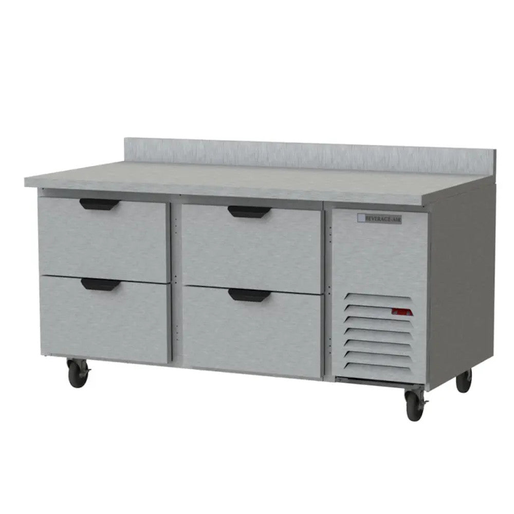 The Beverage Air WTRD67AHC-4 has a heavy duty construction that includes exterior stainless steel on front, sides, door(s) and grille. Cabinet back and bottom are galvanized steel. Interior liner is made of corrosion resistant aluminum. Interior thermometer is standard. In cabinets with doors and drawers, doors are mounted to face of cabinet on cartridge-style hinges permitting them to self close under their own weight. Hinges also allow doors to stay open 120° and permit easy door removal for service and cleaning if required. A plug-in type vinyl magnetic gasket is attached to each door for positive seal. Cabinet insulation is CFC and HCFC-free foamed-in-place polyurethane of two-inch minimum thickness. Units are supplied with 6” high casters. Front casters have wheel locking mechanism.