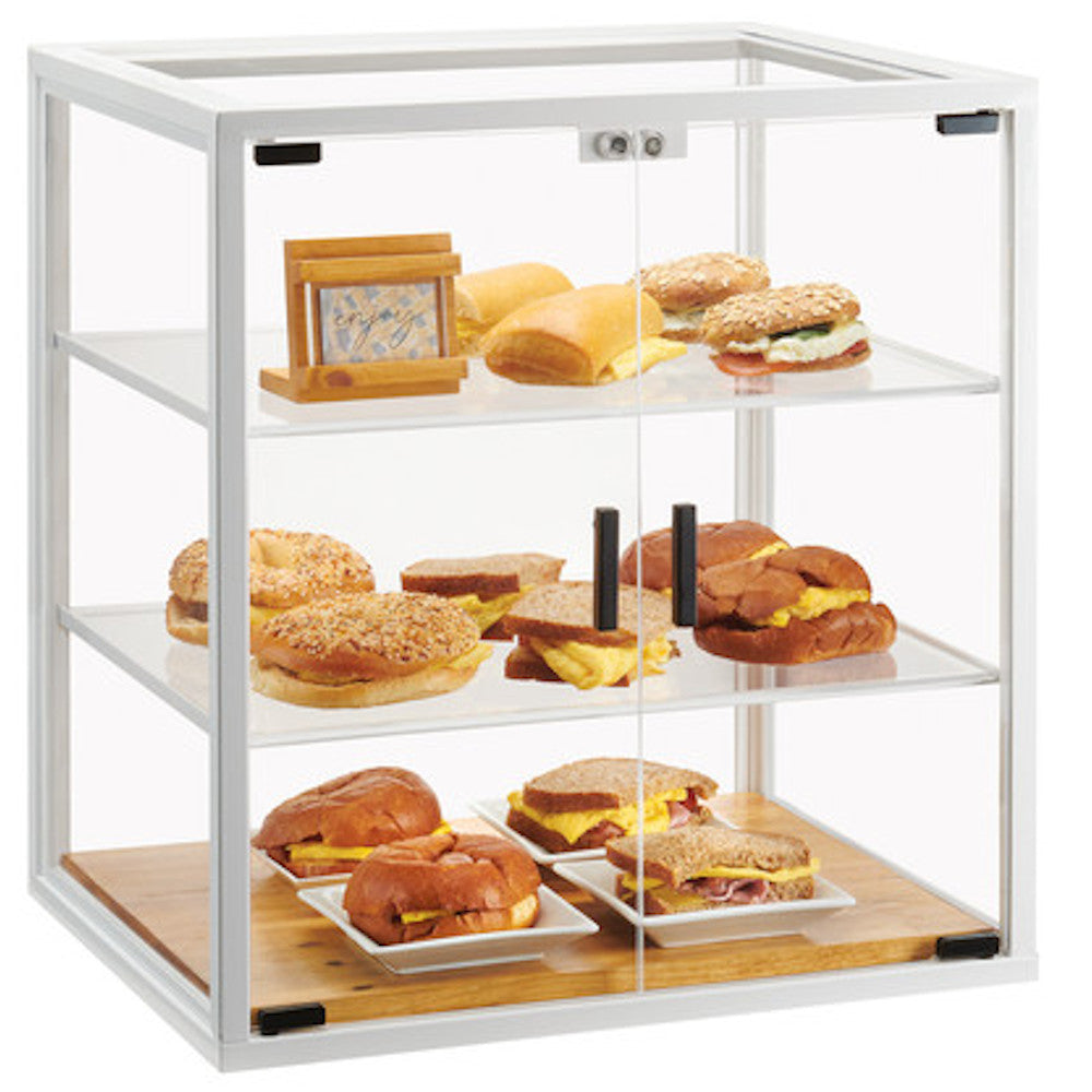 The Cal-Mil 4312-15 is a countertop Monterey display case. It has three tiers. It is made of acrylic and steel. The 4312-15 has dual hinged doors with handles.