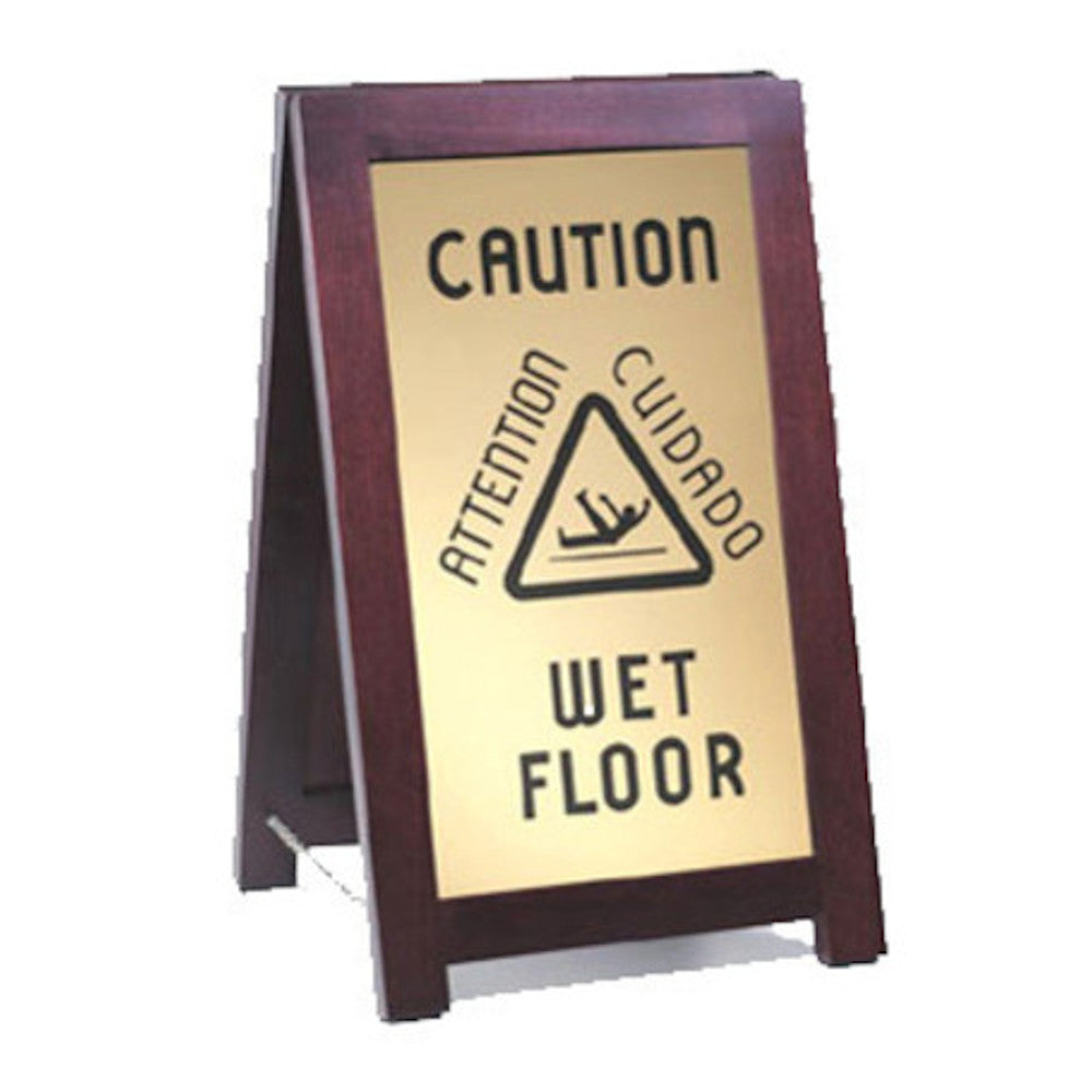 The Cal-Mil 851-WET is an a-frame Westport wet floor sign. It is double-sided and comes with two gold caution plates. It is bilingual and comes with a chain stop. It is made of wood and has a Mahogany finish.
