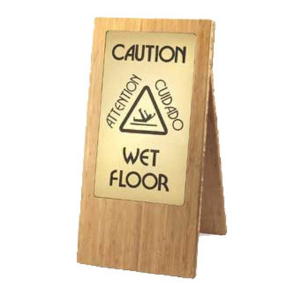The Cal-Mil 852-60 is a double-sided wet floor sign. It has two gold caution sign plates that are bilingual. It is made of wood and has a bamboo finish. The 852-60 is a BPA-free.