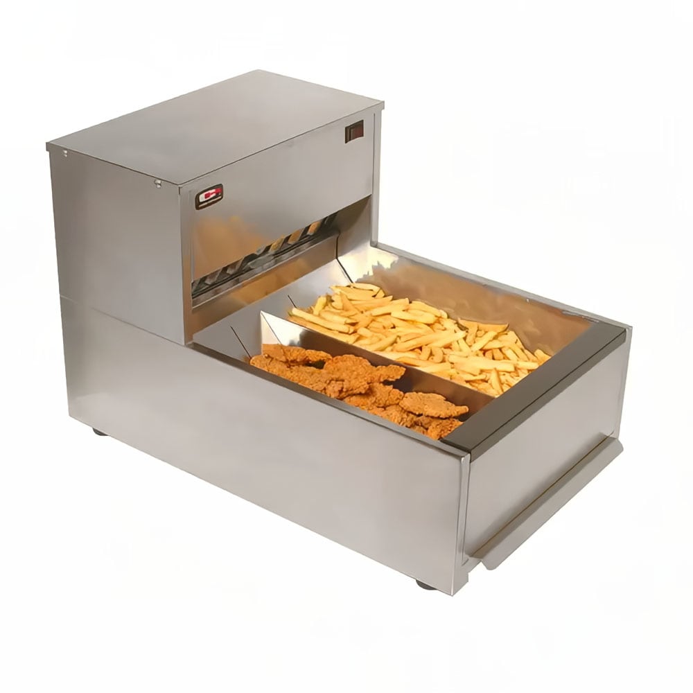 This Carter-Hoffmann Countertop French Fry Warmer has a polycarbonate bar to decrease the risk of nasty burns, and its stainless steel design makes it painless to clean. Its innovative design allows you to expand the holding by removing its dividers. This gives you the ability to heat items in large proportions or several items at once, depending on the placement of the dividers. Its collection pan and oil filter keeps the heater component safe, while preventing your fries from becoming too greasy. The oil pan and oil filter are easily removable for cleaning, and the oil filter is dishwasher safe.