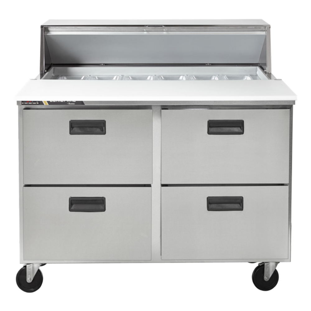 Centerline™ by Traulsen Compact Prep Table Refrigerator, (4) fully removable drawers, 48"W, holds (12) 1/6 size pans 4" deep pans (included), rated for use with 6" deep pans, each drawer accommodates (1) 1/2 size pan & (1) 1/3 size pan, stainless steel exterior, anodized aluminum interior, full length removable cutting board, electronic control with LED display, 4" casters, R290 Hydrocarbon refrigerant, 1/5HP, 2.6 amps, cETLus, ETL-Sanitation.