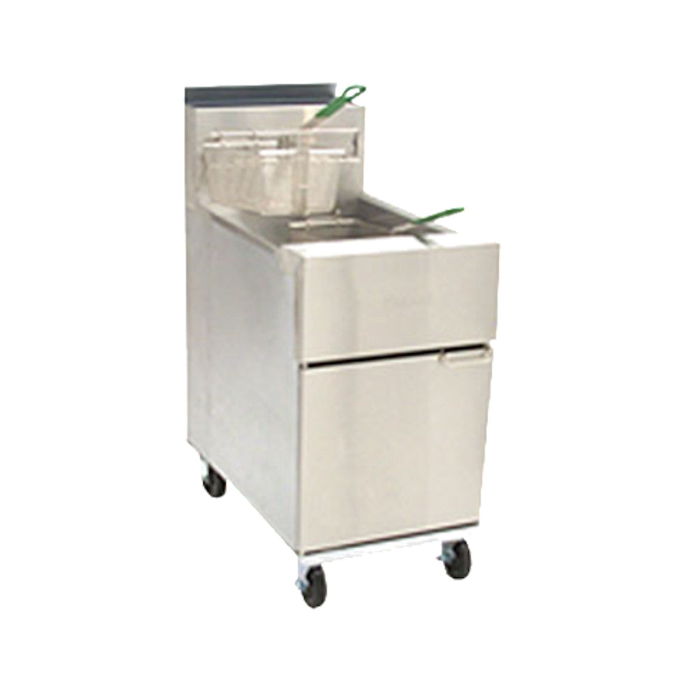 This Dean SR162G Gas Super Runner Valve Fryer is the perfect way to fry chicken nuggets, french fries, seafood, and more. It has a tube-type frypot design and comes with 2 twin baskets. This allows you to fry more at once. It has a millivolt control system which requires no electrical hookup. It uses natural or LP gas (gas type must be specified) and includes a 3/4" NPT gas connection. This Fryer has a 75 lb. oil capacity and its frying area is 18" x 18" x 3-3/4". Its stainless steel frypot, front, door, and backsplash/flue cover make it easier to clean. This SR162G has durable temperatures probes, a thermo-tube design, and a wide cold zone.