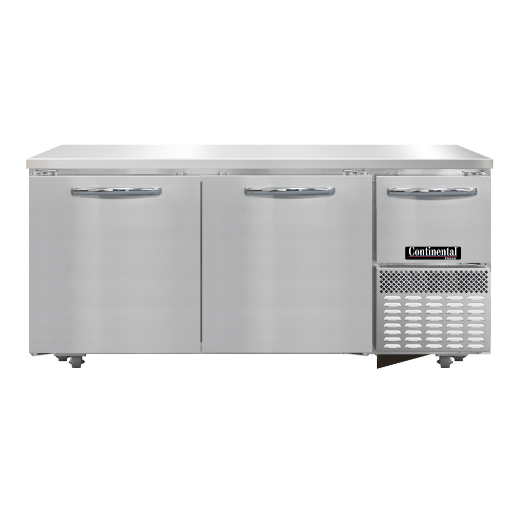 Undercounter Freezer Base, 68" wide, #300 Series stainless steel work top, stainless steel front and end panels, galvanized steel rear and grill, aluminum interior, (2) full & (1) half height field rehingeable doors, 1 3/8" diameter plate casters mounted on heavy-duty support plates (field installed), electronic controller w/ digital display, front breather air divider (field installed), side-mounted refrigeration, hp