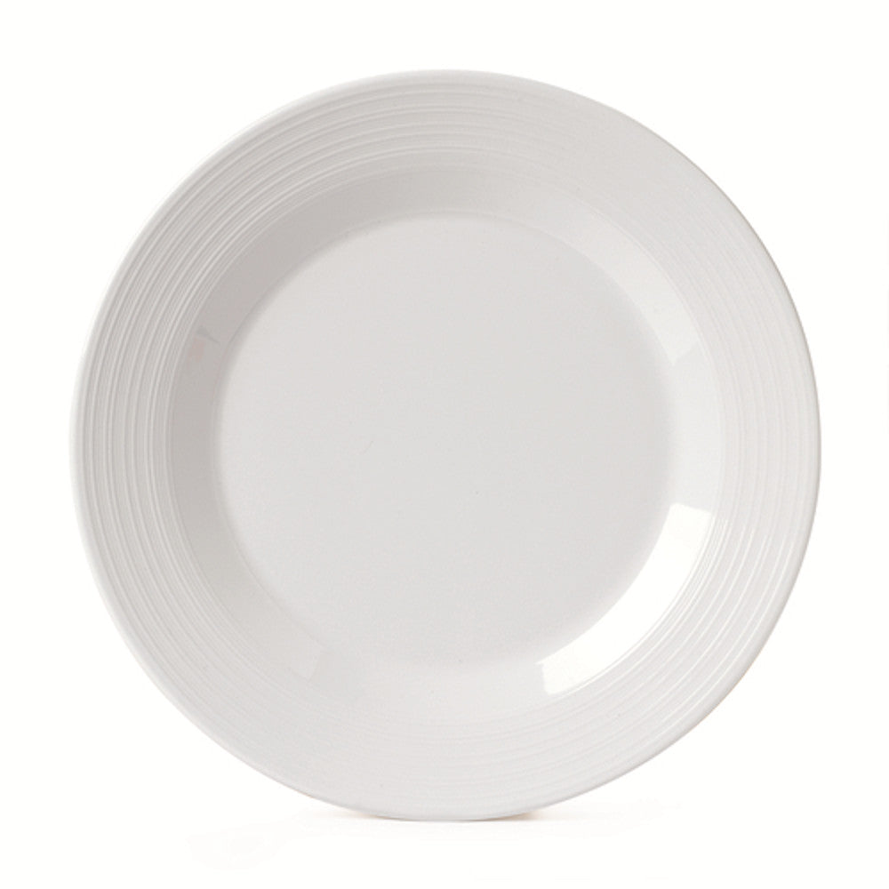 The PT-10-MN-W Minski™ is a 10 ½ inch round textured, wide rim plate. It is perfect for any evening menu item. It is made of a strong melamine, making it lightweight. However, it resembles high-end china. The PT-10-MN-W is break resistant and durable, so it will easily withstand time. It is also BPA free and dishwasher safe.