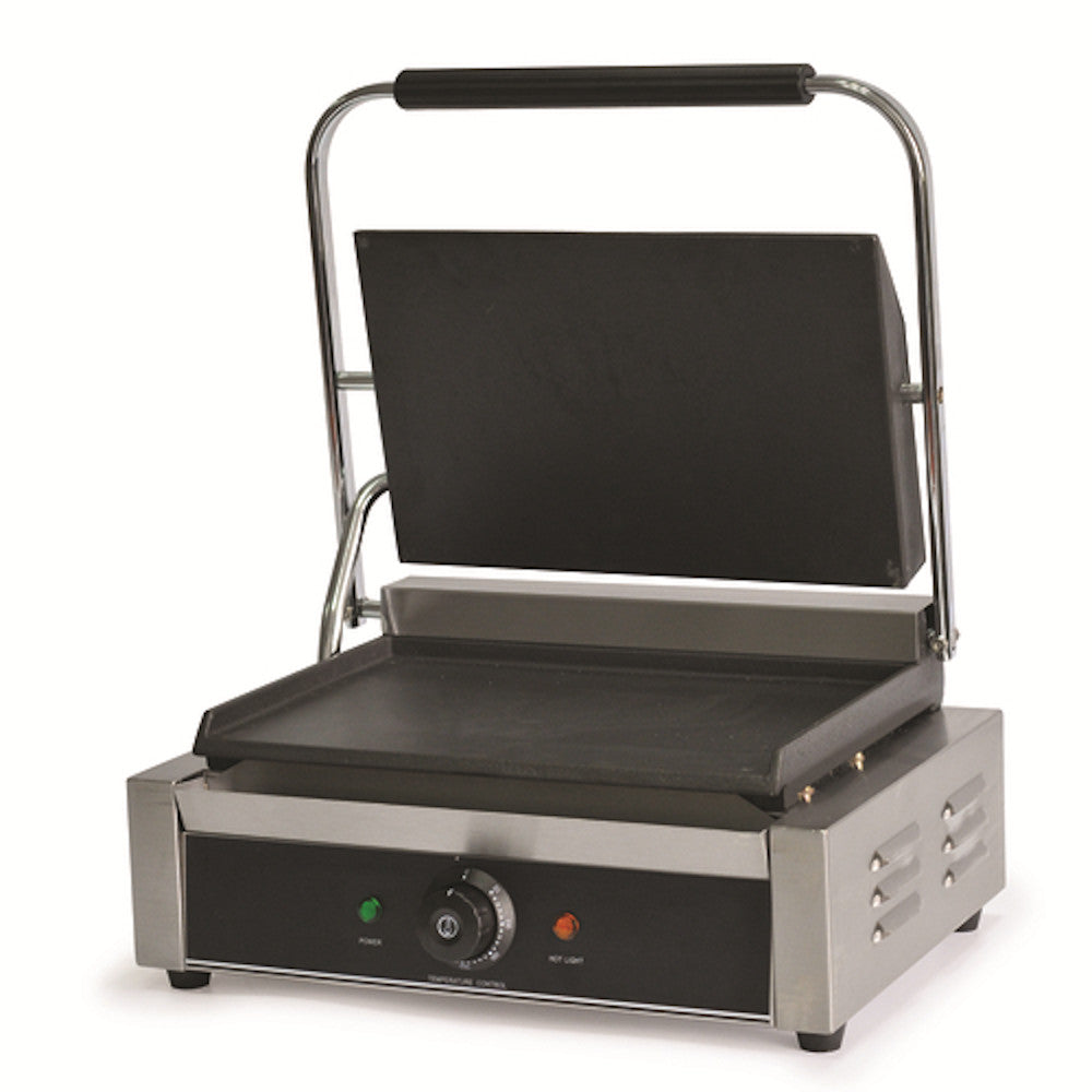When you purchase Global Solutions by Nemco's GS1620, you are investing in a durable, easy-to-operate panini and sandwich grill. It has seasoned, heavy-duty flat case iron heater plates that heat from the top and bottom simultaneously. The 13" x 8-1/2" cooking surface is large enough for preparing Texas-toast-sized sandwiches. The single temperature control adjusts temperatures from 120°F to 570°F.