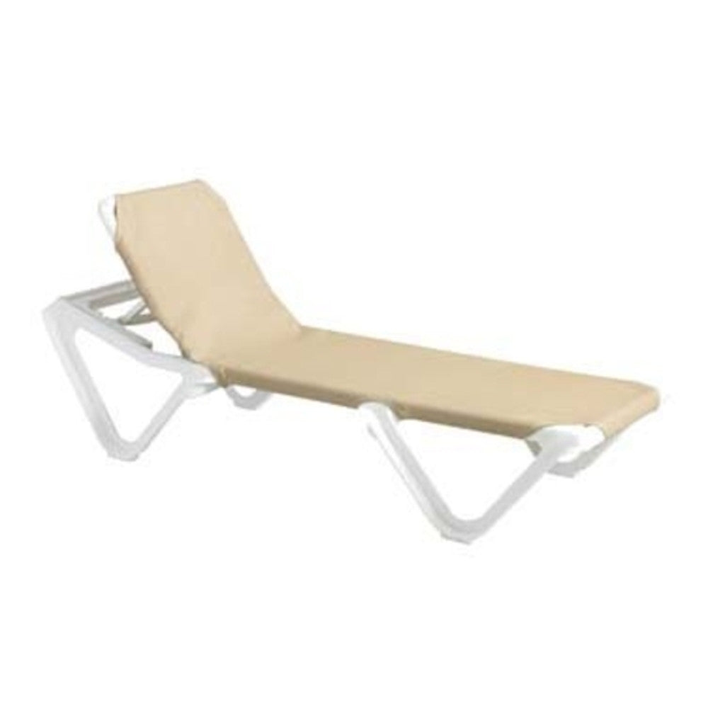 The Grosfillex 99101003 is an armless Nautical chaise perfect for relaxing by the pool or on the beach! The resin white frame is the perfect backdrop alongside the khaki sling, which is resistant to mildew, mold, and fungi. The deisgn of the 99101003 is commercially-rated for sanitation and cleanup. The chaise is UV resistant as well to make it longer lasting in bright and trying sunlight.