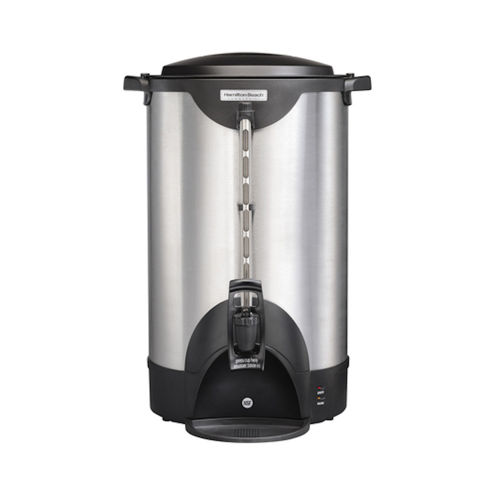 The Hamilton Beach HCU100S is a commercial duty coffee urn. It has the capacity to hold and dispense 100 cups; 2 cups per minute. It has a durable double-wall insulated design with a stainless steel tank.It has a shielded water level indicator and locking lid. The drip tray is removable for easy cleaning and maintenance.