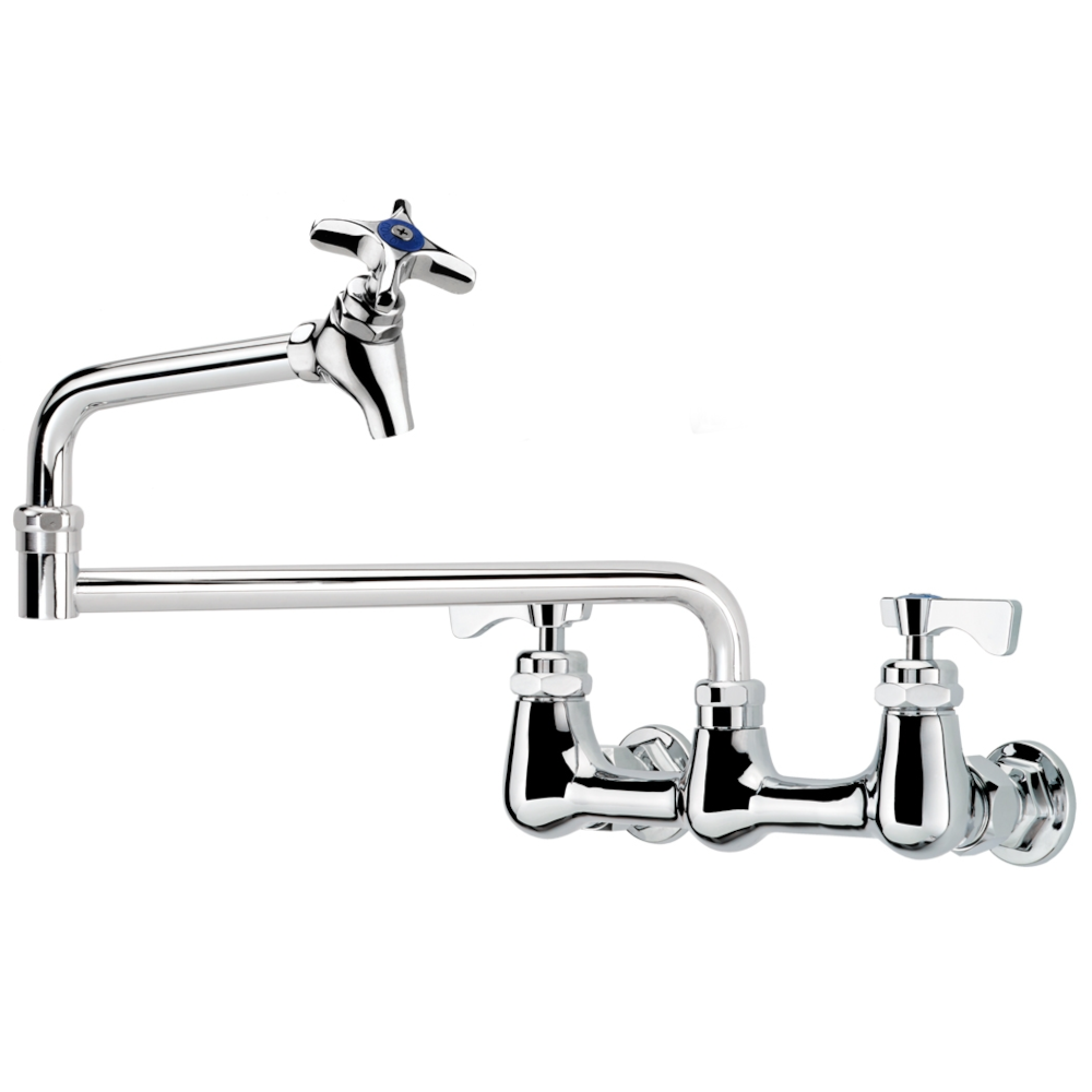 This Krowne Metal 16-252L Kettle/Pot Filler Faucet has been designed to be wall mounted. It has an 18" jointed spout with convenient shut-off valves and ceramic cartridge valves to control the flow of cold and hot water. It has 8" centers for mounting and a wall mounting kit has been included for your convenience. This 16-252L is low lead compliant.