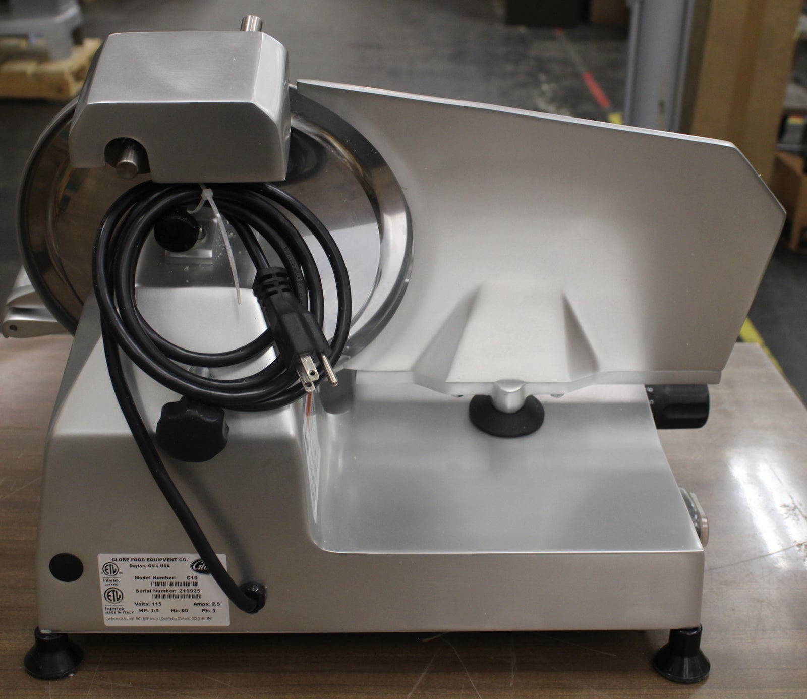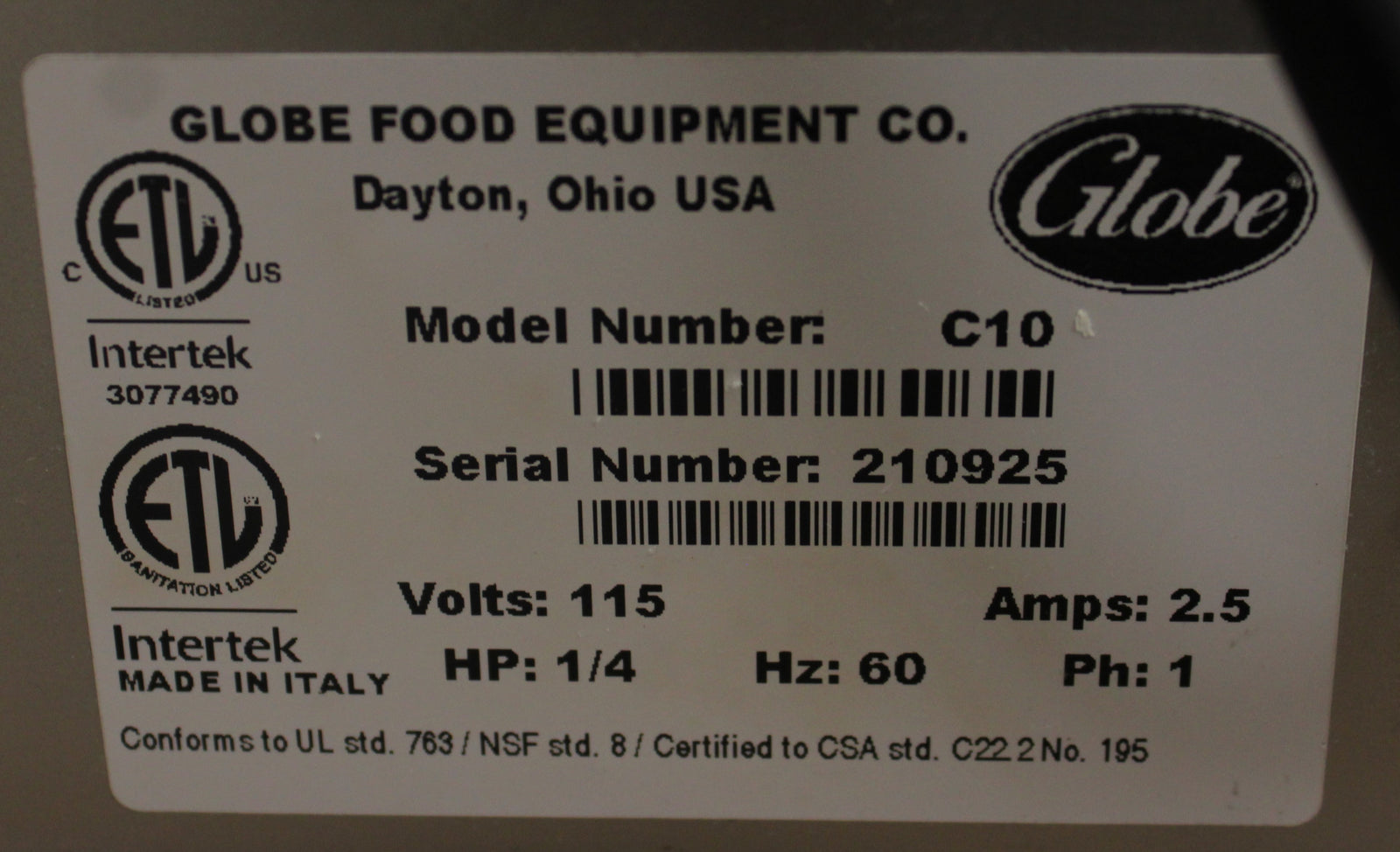 The C10 is a Globe C-Series Compact Manual Slicer. The anodized aluminum base is stain resistant, long lasting, and easy to clean. The design in lightweight, compact, and space saving. The slicer has a hard chromed, special alloy hollow ground knife, a top mounted all metal knife sharpener, and metal bottom enclosure. The chute, slice deflector, knife cover, and sharpener are all removable and easy to clean. The on/off switch is moisture proof and easy to clean. The splash zones are sealed for added sanitation and electronics protection. The handle is ergonomically designed and has dual purposes.