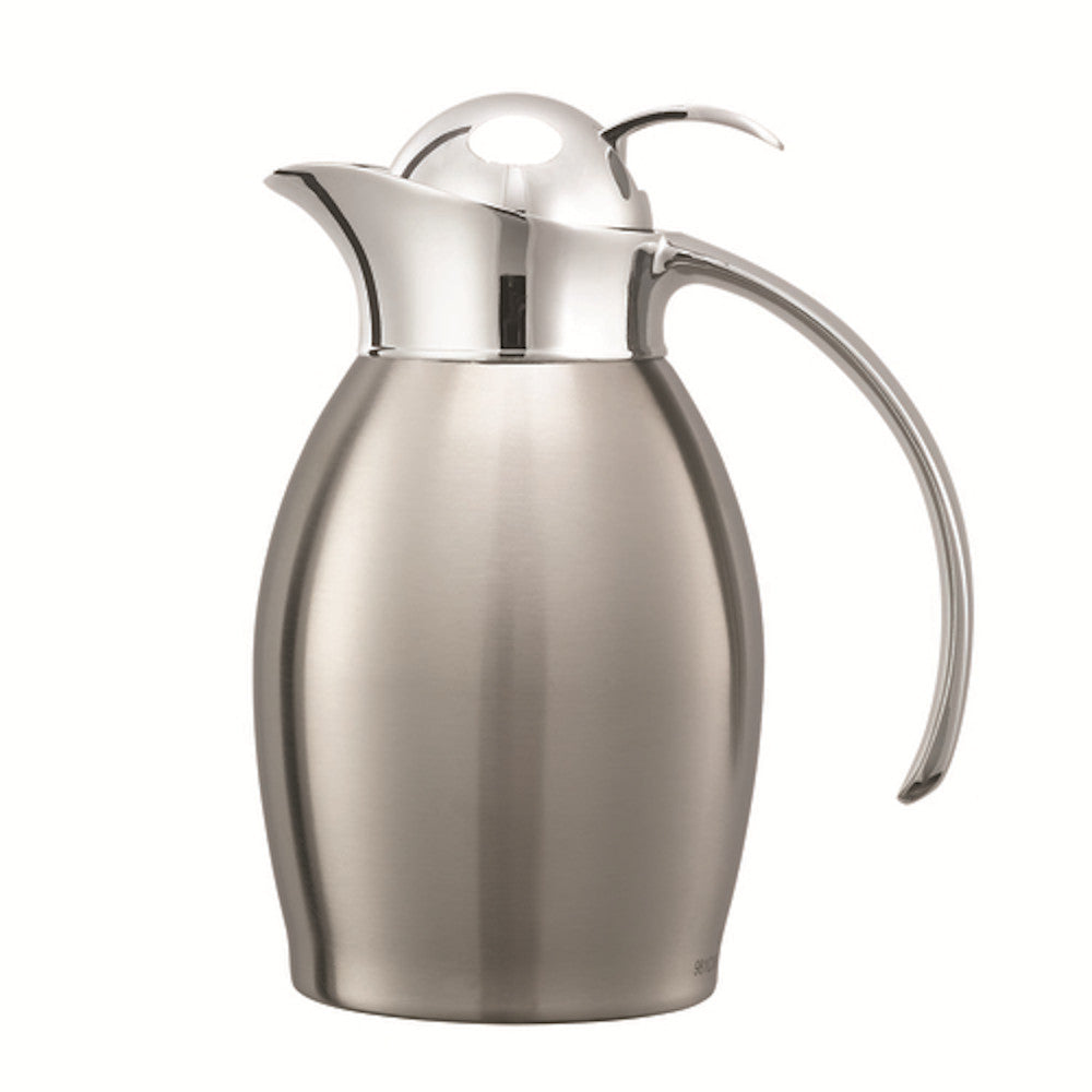 The Service Ideas NIC06BSPB is a 0.6 liter carafe. It retains product quality for 4-6 hours, in part, because of its vacuum insulation. It has an 18/8 stainless steel construction with a brushed finish. The NIC06BSPB includes a push button lid.