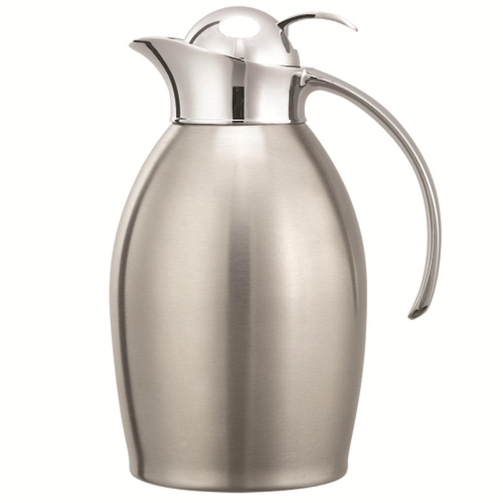 The Service Ideas NIC10BSPB is a 1-liter carafe. Holding beverages safely for 4-6 hours, it is perfect for front-of-the-house applications. It has a stainless steel construction and a brushed finish. The NIC10BSPB has a push button lid style.