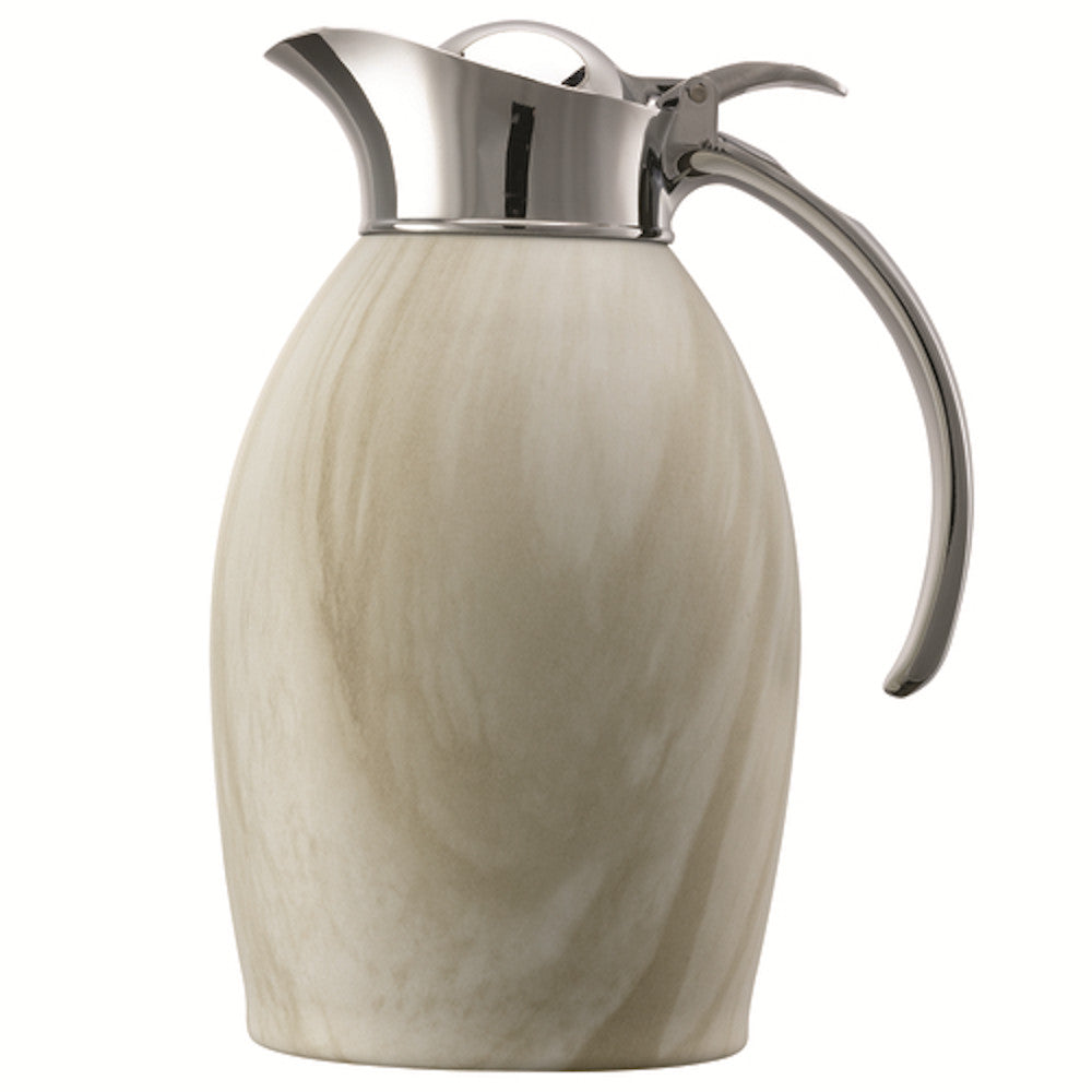 The Service Ideas NIC10BSWM is a 1-liter beverage server. It retains product temperature and quality for 4 to 6 hours thanks, in part, to its vacuum insulation. It is engineered from 18/8 stainless steel. It has an attractive hydro-dripped white marble finish. The NIC10BSWM is not dishwasher safe; must be hand washed only.