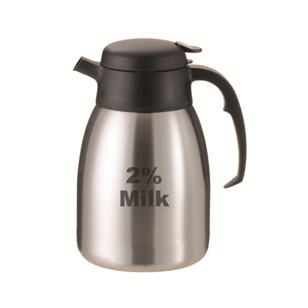 The Service Ideas FVPC152PCTET 1.5 liter SteelVac carafe is ideal for foodservice operations thanks to its durable construction and temperature retention. The FVPC152PCTET is constructed of 18/8 stainless steel, has an attractive brushed finish, and unbreakable liner. "2% milk" has been etched on its side. The vacuum insulation retains product temperature for up to 6 hours!