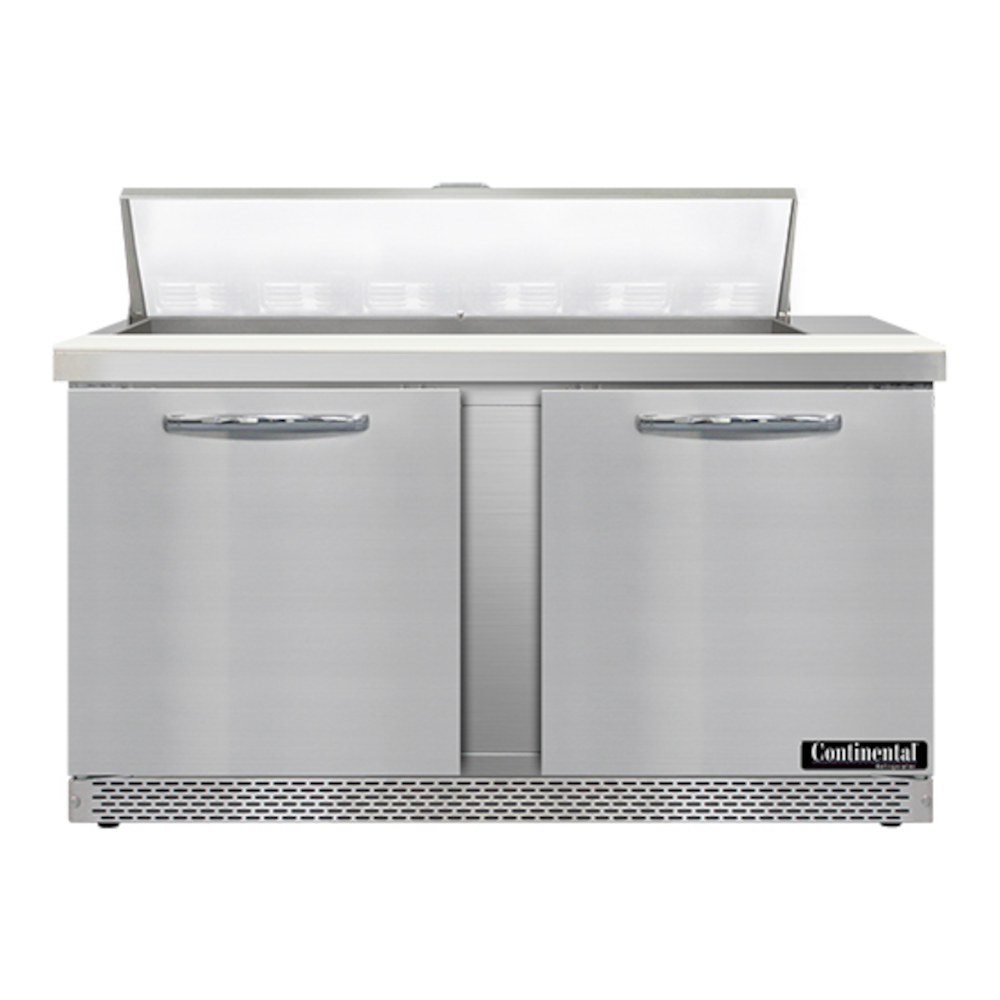 Sandwich Unit, Front Breather, 60" wide, two-section, (12) 1/6 size x 4" deep pans with 12" cutting board, (2) field rehingeable doors, stainless steel top, front and end panels, aluminum interior, 3-3/4" casters, rear mounted self-contained refrigeration, 1/3+ hp