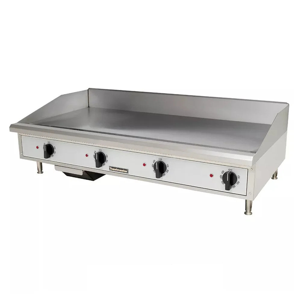 Cooking breakfast foods, sandwiches, vegetables, and dessert has never been easier! This Toastmaster TMGT48 is a high-performing Gas Griddle. With 20,000 BTU aluminized steel "U" shape burners every 12", it has multiple cooking zones. These zones are individually regulated by separate thermostat controls. The controls adjust the burners and steel radiants to maintain the set temperature, ranging from 150°F to 450°F. This TMGT48 has a stainless steel bullnose, front panel, and removable drip tray for easy cleaning. Its steel plate has been polished to help prevent food from sticking.
