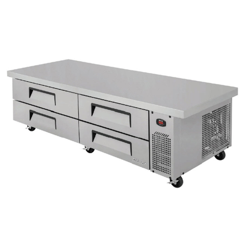 This Turbo Air TCBE-82SDR-N 84" Four Drawer Super Deluxe Refrigerated Chef Base is efficient, durable, and easy to maintain. Its self-contained refrigeration system uses environmentally friendly R290 Hydrocarbon refrigerant to hold items at the best temperatures for food preservation. Keeping items at 33°F to 38°F, it uses efficient evaporators and condensers for faster cooling. Its side mounted compressor is easy to service, while its front breathing feature allows it provide high efficiency even in narrow spaces.
