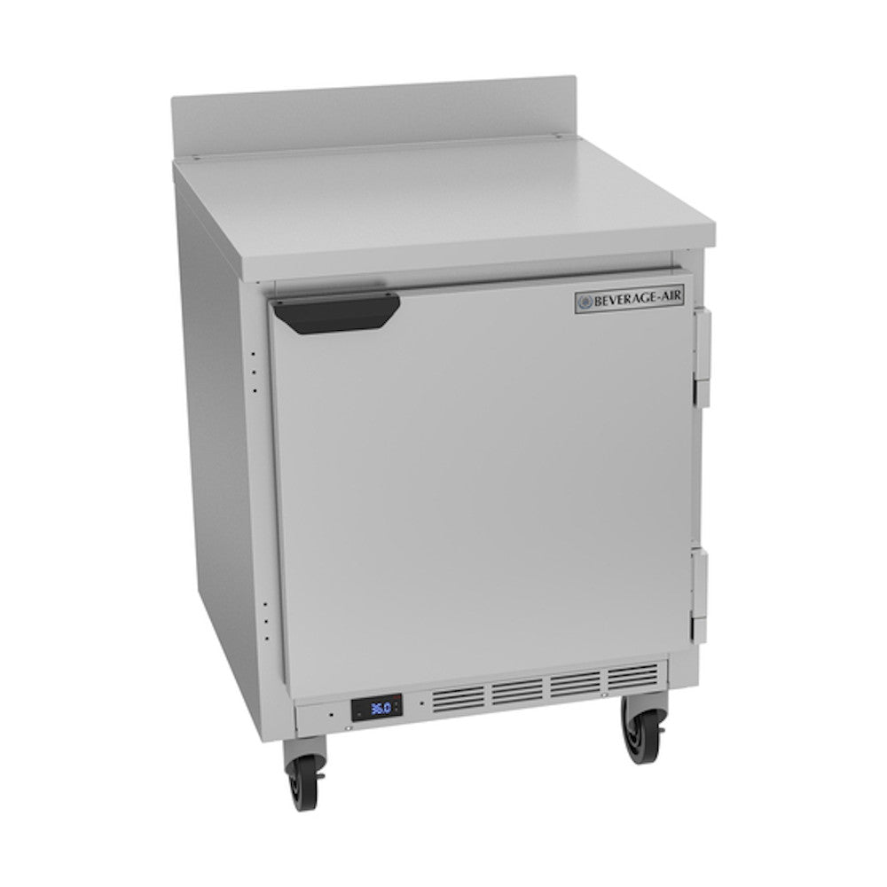 The Beverage Air WTF27HC 20” and 27” base models are designed to fit in limited space with stainless steel exterior and aluminum interior. Stainless steel 2 1/2” thick worktop with 4” high removable backsplash and 2” thick CFC and HCFC-free foamed-in-place polyurethane insulation. Cartridge style hinges with black anodized aluminum pull style door handle and 120° stay-open door feature. Snap-in-place vinyl magnetic gaskets. Standard options: 6” high legs* and 2 steel wire epoxy coated shelves per door section.